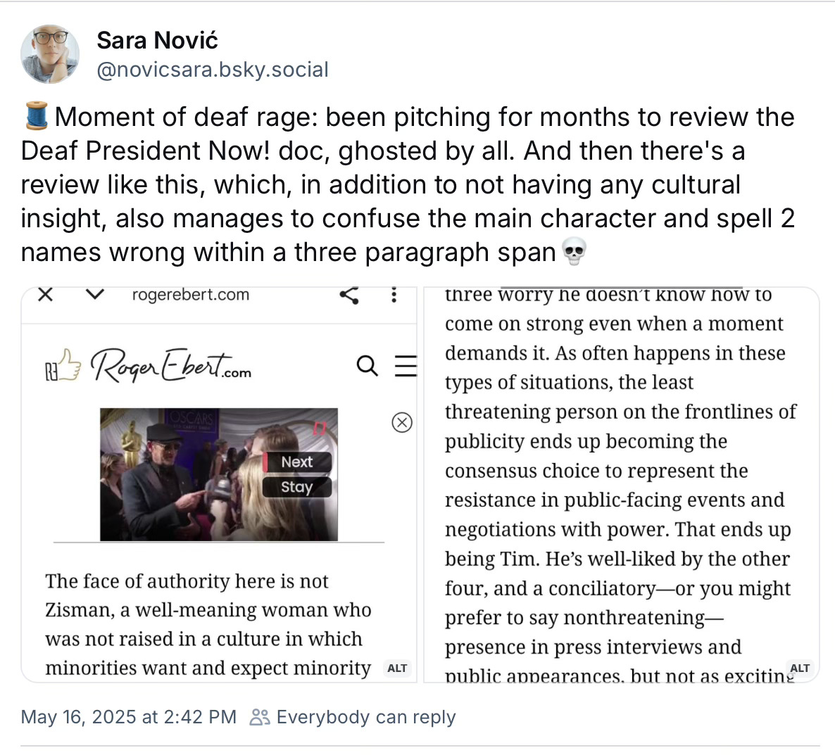 I’ve always said I don’t want to be the only disabled journalist writing about these things, and I shouldn’t be. I don’t know the specific limitations Deaf writers face, all I can do is funnel that through being a disabled wheelchair user. Two different life experiences. I do, however, try to use my platform and name as a disabled journalist to, hopefully, make people more open and aware of Deaf/disabled writers in general. But, these days, I don’t think anything is working. The coverage of Deaf President Now! illustrates that websites either don’t care about authentic writing, don’t know any Deaf/disabled critics, or don’t want to put in the time and effort to find them. Though, let’s be real, it’s probably all three.
